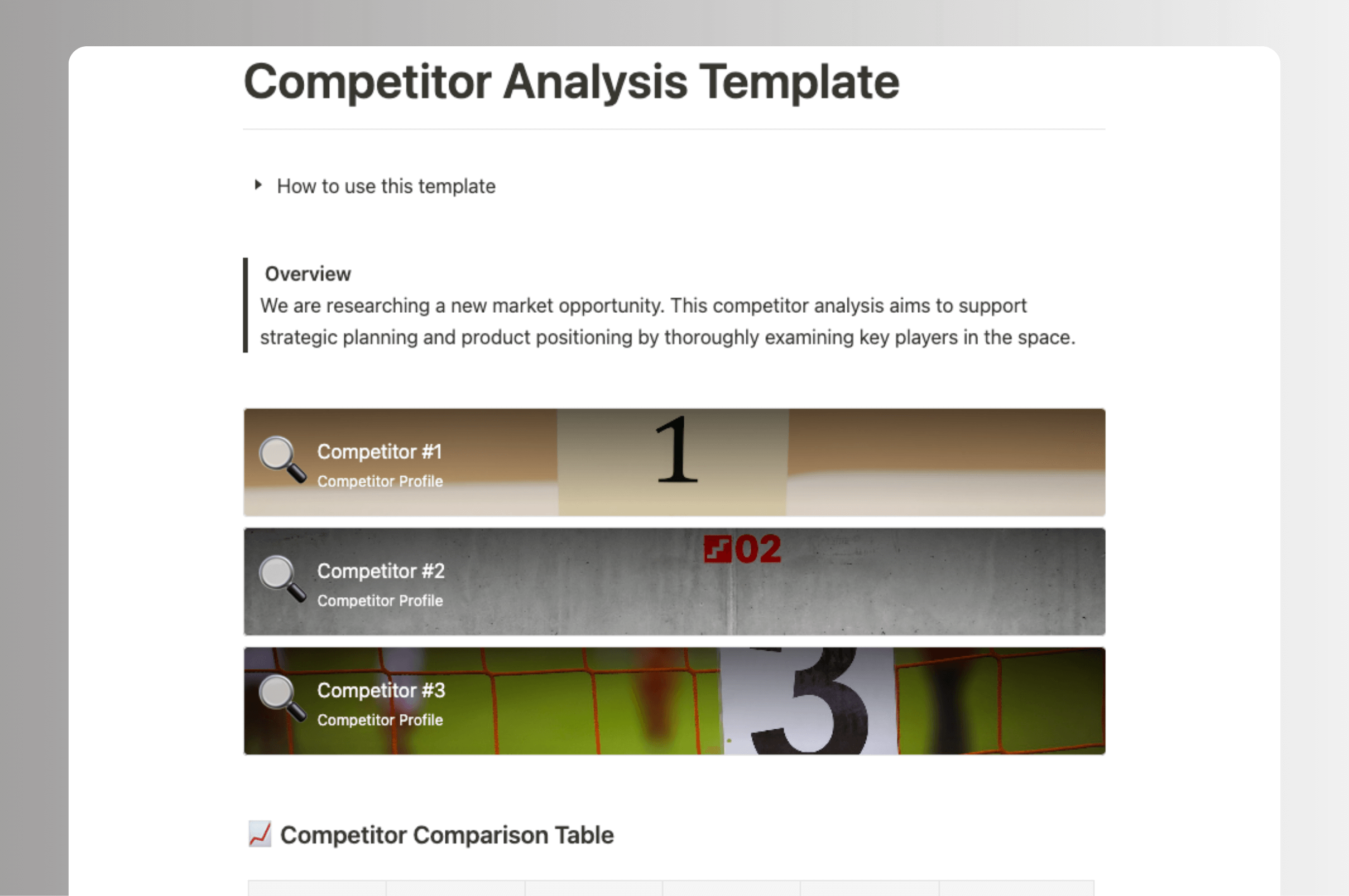 確実な競合分析は、戦略的な明確さの基盤です。このテンプレートにより、チームは競合インサイトを効率的に収集、比較、活用できます。ポジショニングの強化、市場機会の発見、自信を持ったビジネス判断に活用してください。競争環境をより深く理解する準備はできましたか?今すぐ分析を始めましょう。