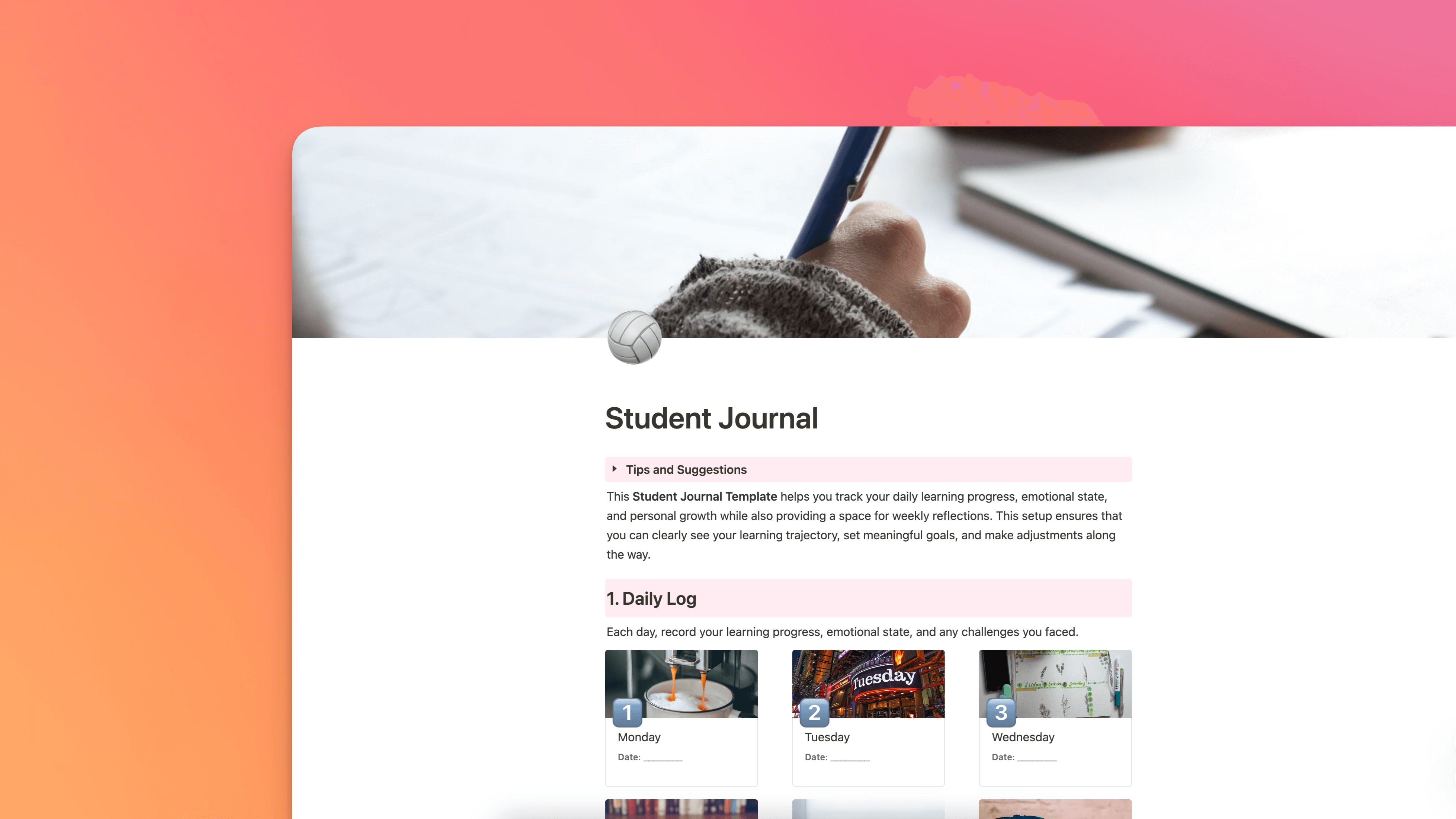 Студенческая жизнь — вихрь задач, заданий и личностного роста. Чтобы помочь вам оставаться на вершине академического пути, мы создали шаблон студенческого журнала. Он даёт структурированный способ документировать прогресс, рефлексировать над опытом и ставить цели на будущее. Ведя журнал ежедневно и еженедельно, вы повышаете продуктивность, остаётесь организованными и отслеживаете личный и академический рост со временем.
